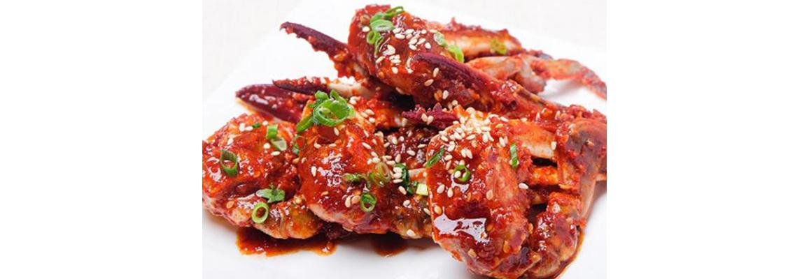 新鮮な渡り蟹をテジョンデ自慢のヤンニョムに漬けました。やみつきになる辛さです。ケジャンは、韓国ではあまりの美味しさに「ご飯泥棒」と呼ばれています。