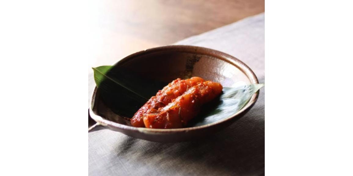 厳選した素材に、数種の唐辛子と昆布、柚子を加え、できるだけ少ない素材で旨味を引き出した無着色明太子。