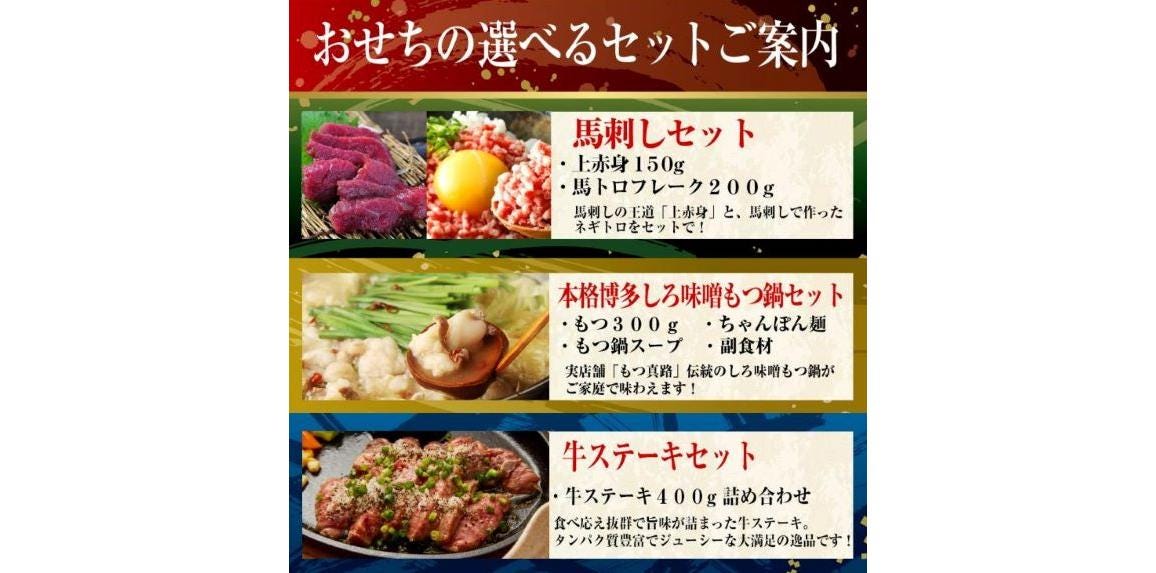 馬刺しセット、もつ鍋セット、牛ステーキセットから好きな料理を選べるおせちです。
