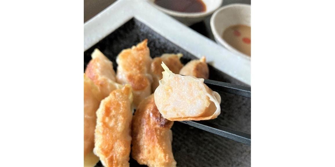 無保水(食品添加物である保水剤を一切使用していない)の海老を使用し、エビ本来の旨味と食感を堪能できる海老餃子。