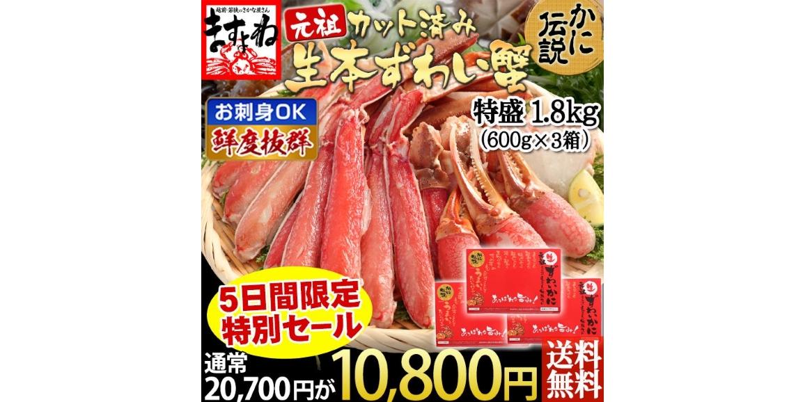 5日間限定!かに伝説!特盛1.8㎏(600g×3箱)通常20,700円がなんと10,800円送料無料