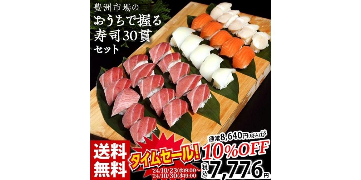 豊洲市場の 『おうちで握る 寿司30貫セット』 マグロ・イカ・ホタテ・サーモン・シャリ