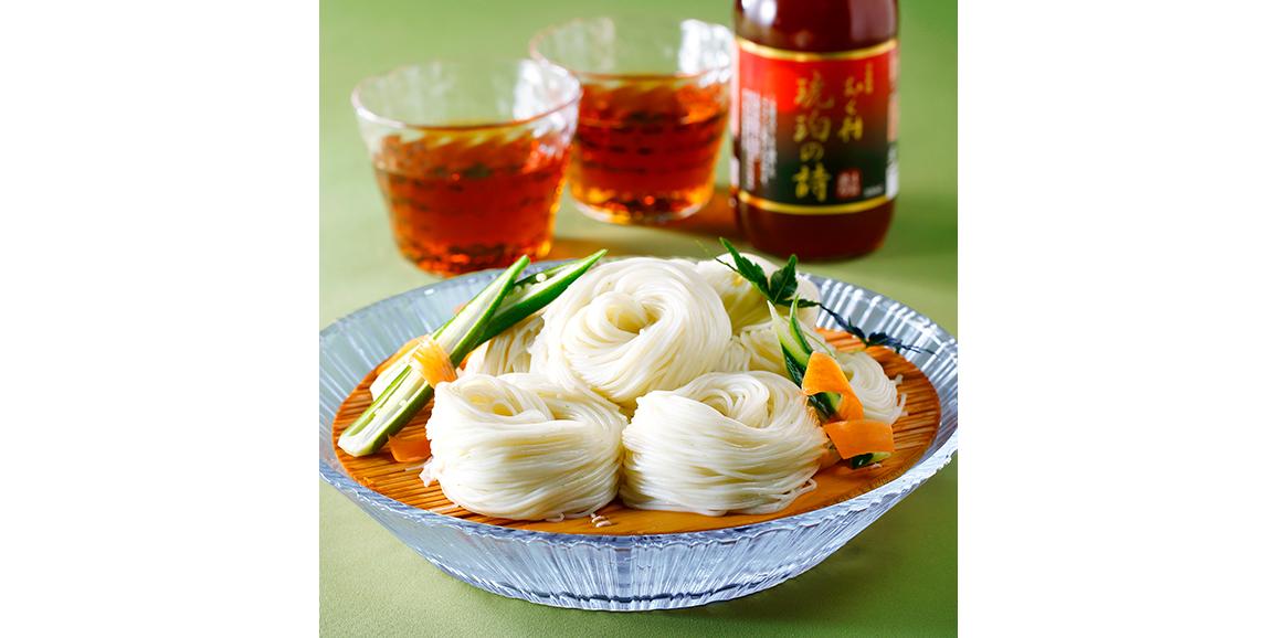 数億年前より熊本県と福岡の一部に生息する水前寺のりは、細川藩より幕府への献上品だった事でも知られています。鉄分カルシウムはヒジキの10倍、保水力が魅力的で貴重な高級食材です。最盛期に比べ現在は1/10まで減少し、絶滅危惧種に指定されている水前寺のりを老舗料亭 日本料理おく村監修の下、水前寺のりを惜しげもなく練りこんでいます。ふんだんに練りこんだ水前寺のりの効果でモチモチとした食感、素麺なのにコシがあり伸びにくいのが特徴です。