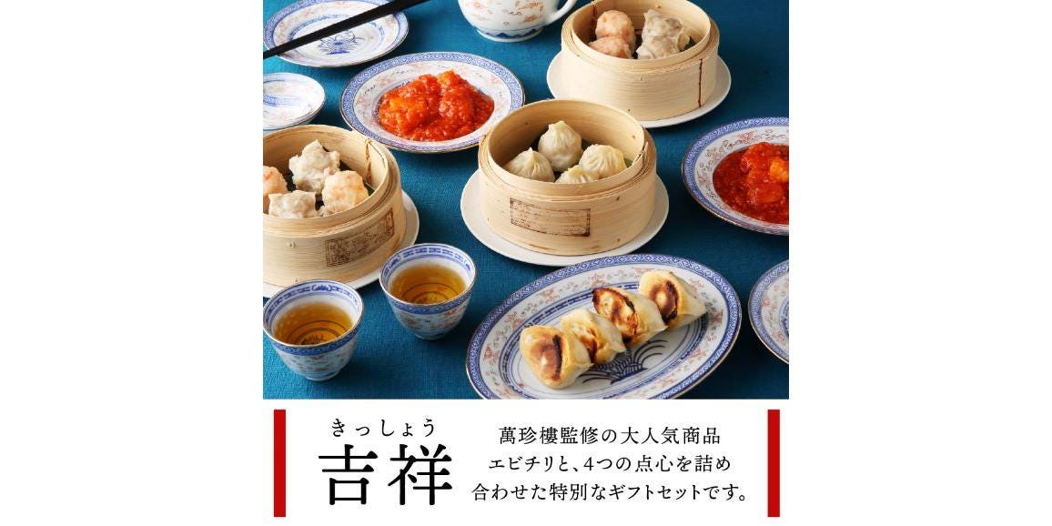 萬珍樓監修の大人気商品「エビチリ」と、4種の人気点心を詰め合わせました。萬珍樓で食べたあの味をご家庭でも。