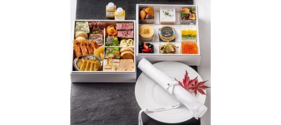 テリーヌが有名なレストラン「レザンファン ギャテ」のシェフ松澤直紀による、選りすぐり満載のフレンチ・ジャポネおせち二段重。 シャンパンやワインに合わせて贅沢な新年のひと時を楽しめます。
