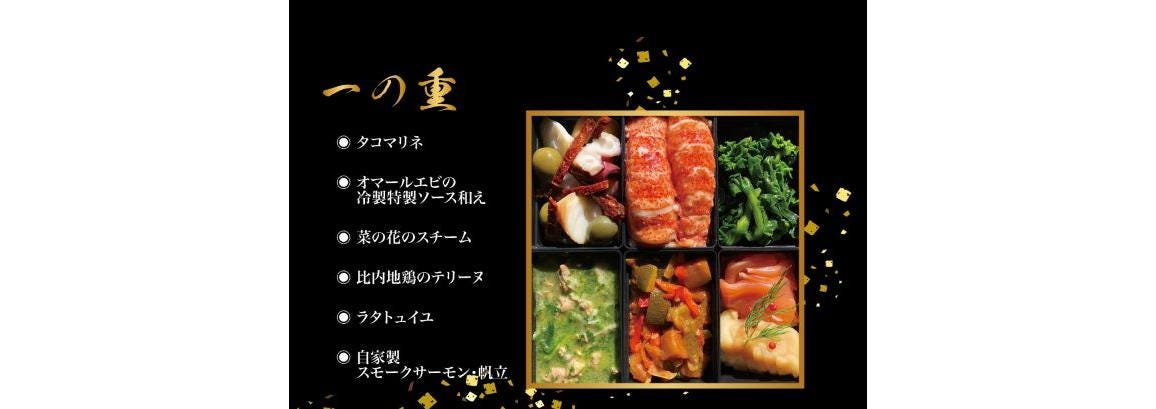 石川県能登食材をふんだんに使った豪華な香箱ガニやアワビを使用し、彩り鮮やかに仕上げた内容は新年にふさわしいおせちです。オマールエビや能登の香箱蟹など正月に相応しい豪華な食材がたくさんつまっています。