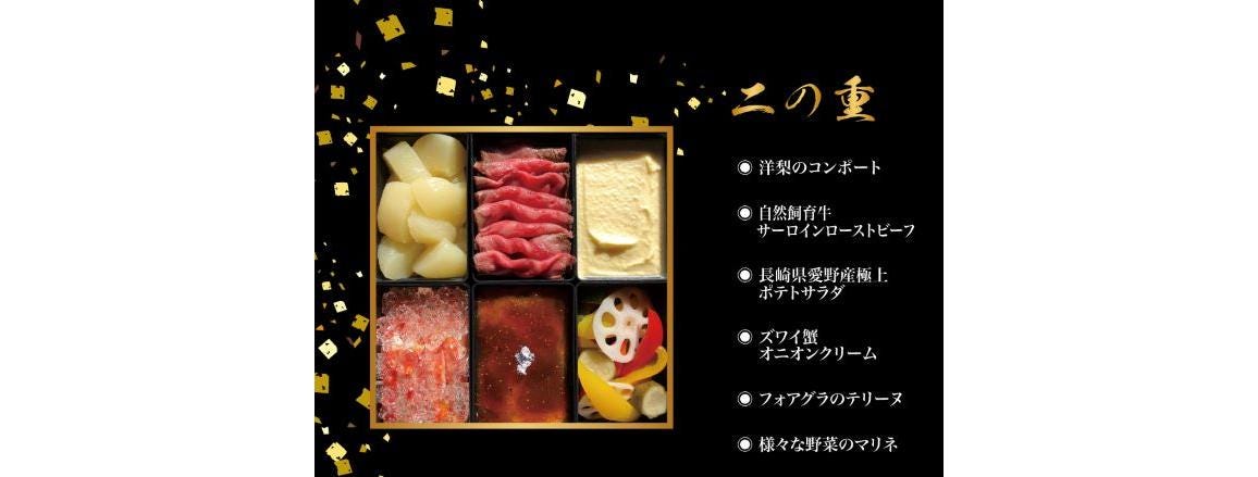 ローストビーフやフォアグラなど、自慢の料理をお重に詰めました。