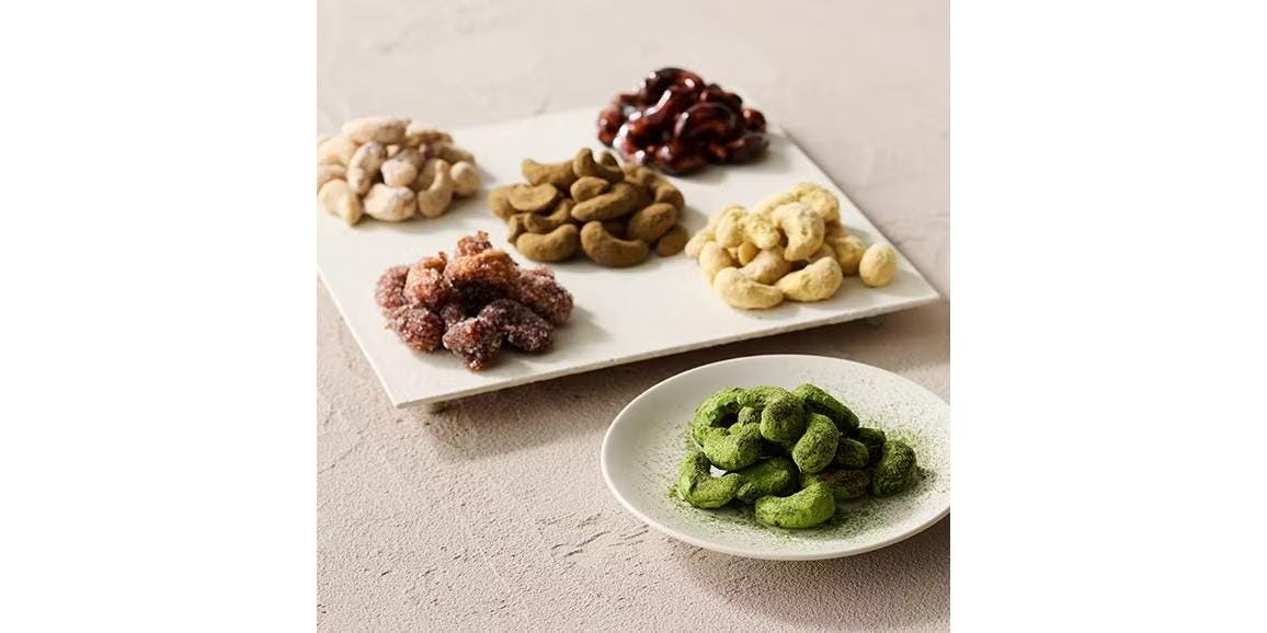 和泉の國・大鳥大社の「千種の杜」にちなんで名付けられた「ちぐさの実」は、一粒から幸福が広がるよう願いを込めた、体にやさしい和の干菓子です。カンボジア産の大粒カシューナッツを、国産キビ砂糖でキャラメリゼし、老舗茶舗の抹茶・ほうじ茶・白味噌・味噌・ざらめ・生姜の6種の和の味でコーティング。保存料不使用で、素材の風味と栄養をそのまま楽しめる逸品です。包装紙には、蝶へと変化するさなぎの成長を描いた臈纈染を使用し、贈り物にも最適。美味しさと健康を両立した、まさに“罪悪感なし”の大人のためのスイーツです。