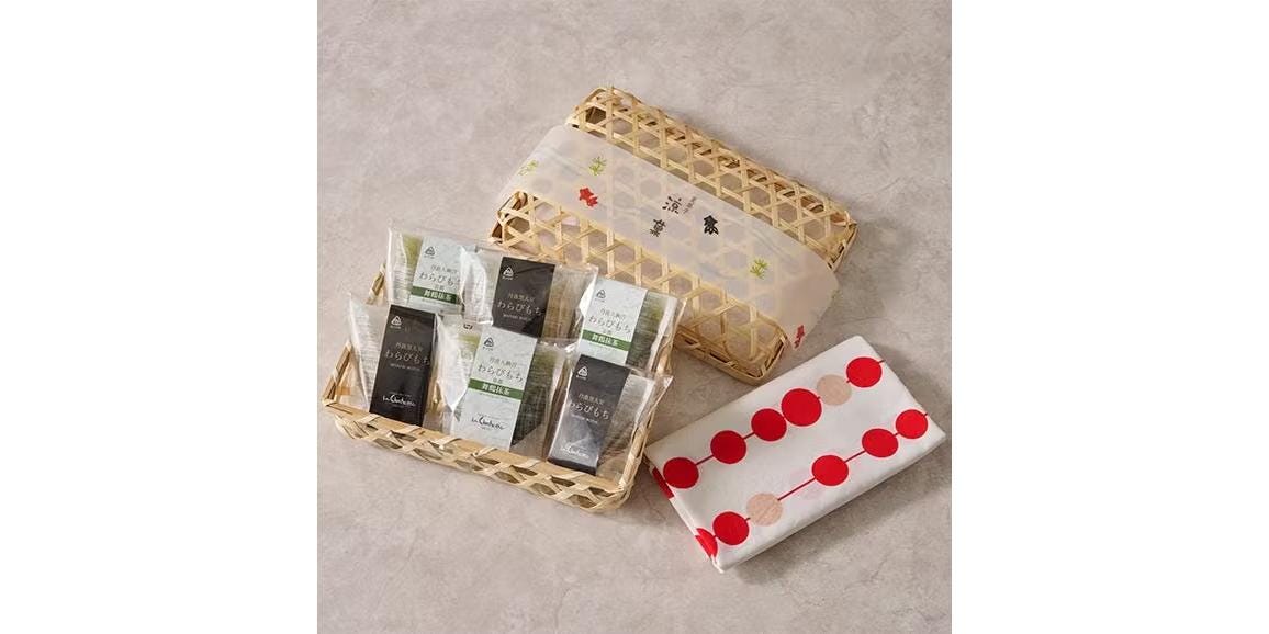 京都・舞鶴の洋菓子店「ラ・クロシェット・ヒラノ」が手掛ける丹波わらび餅「縁(えにし)」は、厳選した丹波黒豆、大納言小豆、抹茶を使用し、職人が丁寧に練り上げた2種のわらび餅詰め合わせです。名水「真名井の清水」を使い、なめらかで繊細な口どけが特徴。個包装に加え、黒大豆きな粉や黒みつ、スプーン、シートが付属し、お好みのトッピングで味の変化も楽しめます。伝統的な竹かごと風呂敷の格式高いパッケージは、接待や特別な贈り物に最適。素材と製法にこだわった上品な味わいで、美と健康を大切にする大人世代にも楽しんでいただける、体にやさしいヘルシースイーツです。