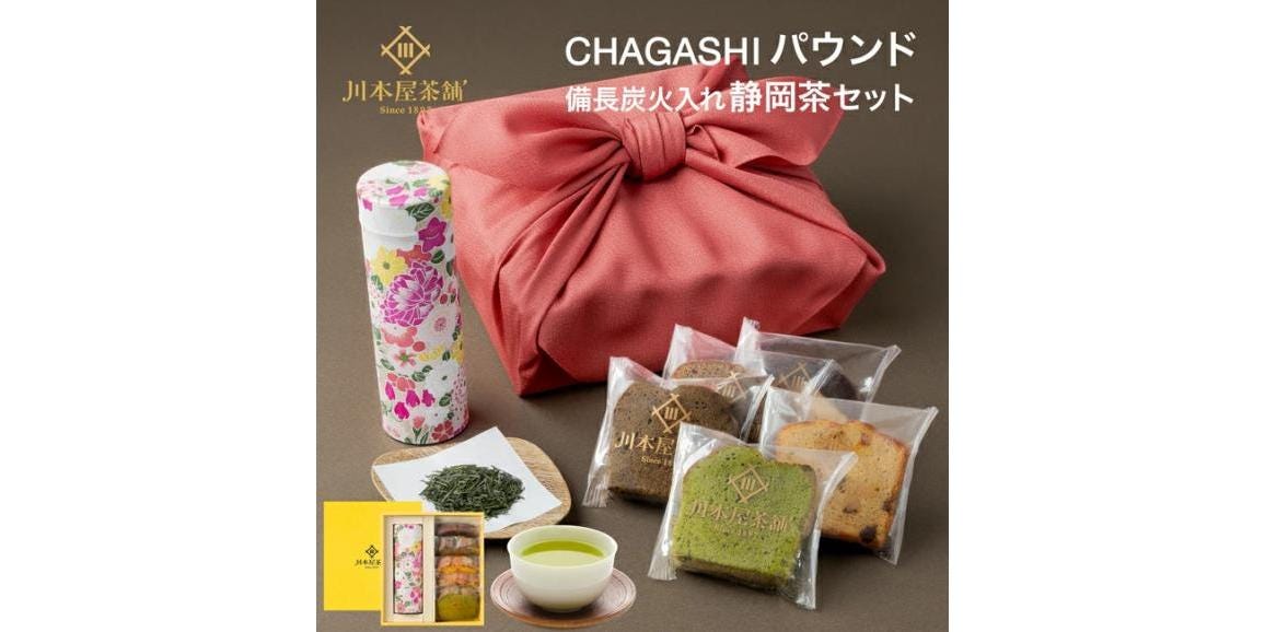 創業100年以上の老舗『川本屋茶舗』がお届けする「CHAGASHI パウンド(お任せ5種) 備長炭火入れ静岡茶セット」です。