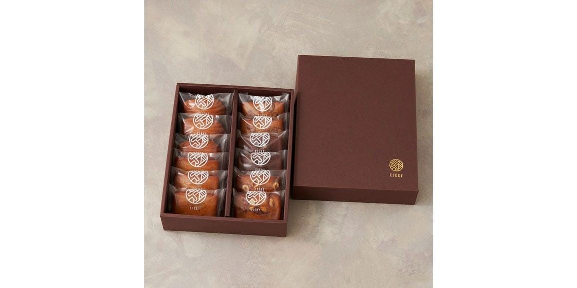 日本橋人形町の古民家フレンチレストラン「人形町 伊勢利」のオーナーシェフが手がける焼き菓子店『ESERY』。「フィナンシェ4種とマドレーヌの詰め合わせ(12個入り)」は、人気のマドレーヌとフィナンシェ4種の詰合せ。