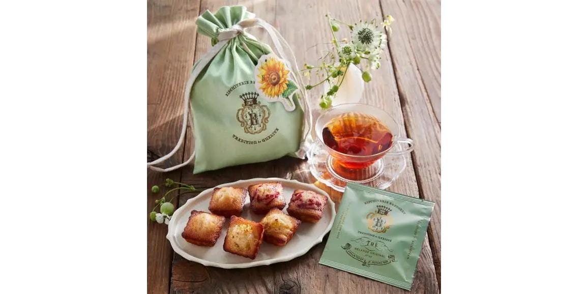 ミントグリーンカラーのオリジナルコットン巾着に、夏限定の爽やかなレモン味のプティ・フィナンシェ〈シトロン〉や、焦がしバターのコク深い〈プレーン〉、甘酸っぱいフランボワーズのコンフィチュールをとじ込めた〈フランボワーズ〉の3種と、ブルトンヌの焼き菓子と一緒にお楽しみいただく為にお作りしたオリジナルブレンド紅茶をセットしました。