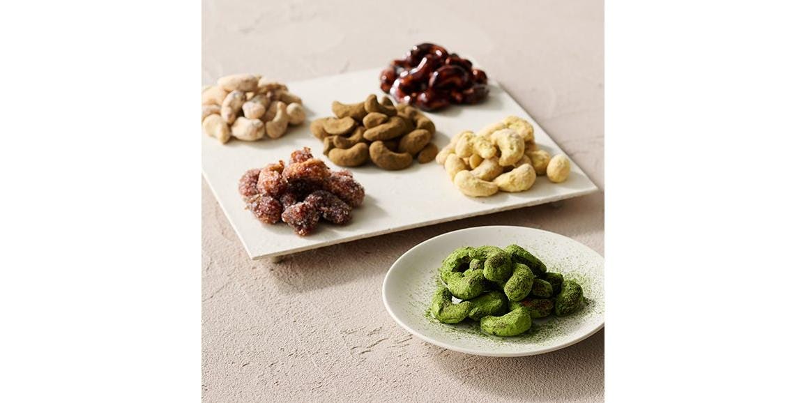 栄養豊富なカンボジア産の大粒カシューナッツを、国産キビ砂糖で丁寧にキャラメリゼ。さらに堺の老舗茶屋・松倉茶舗の抹茶やほうじ茶、白味噌、味噌、ざらめ、生姜の6種の和の味で包み、ナッツの甘みと独特の食感が絶妙に調和しています。保存料を使わず身体に優しい素材のみを使用。包装紙にはさなぎが美しい蝶へと変わる様子を描いた臈纈染(ろうけつぞめ)を採用し、贈り物にふさわしい気配りが光る逸品です。健康と和の趣を感じる特選ギフトとして大切な方へどうぞ。
