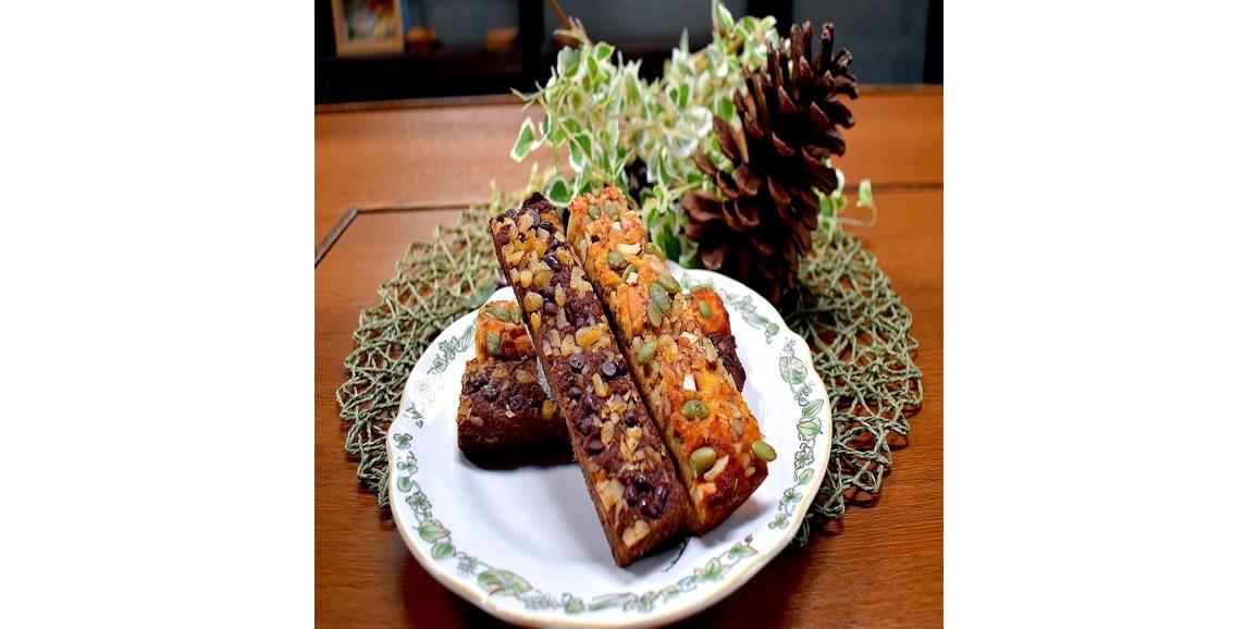 プレーン味は、香ばしいナッツ類(くるみ・アーモンド・かぼちゃの種)をたくさん入れて、しっとりの中にもザクザク感を出しました。