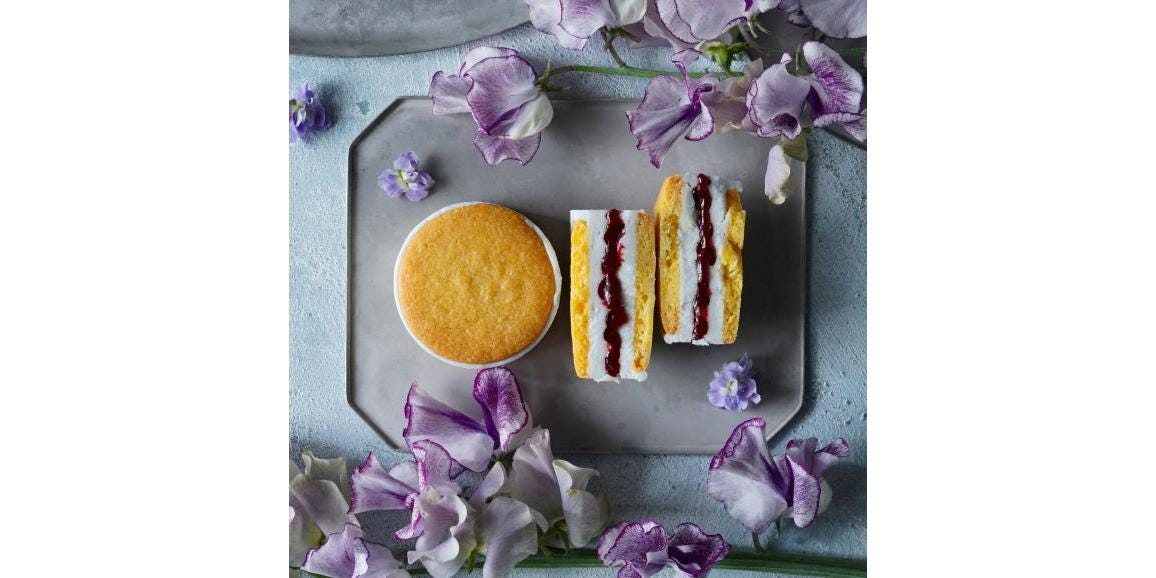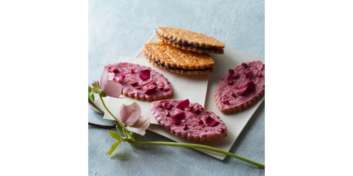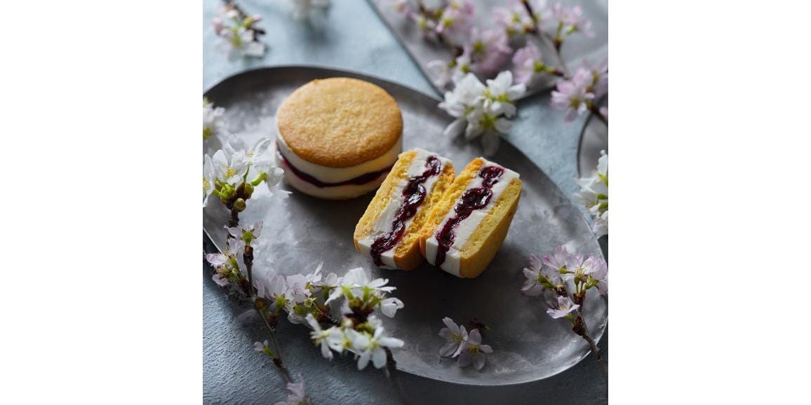バスク生地を使ったオリジナルのバターサンドです。バターは北海道産の最高級バターを使用。粉はフランス産の粉を使いました。フレーバーは、さくらグリオット、ローズフランボワーズ、バイオレットカシスの3種。
