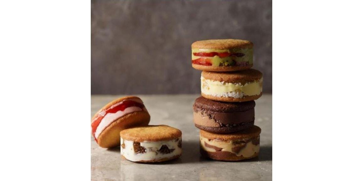 バスク生地を使ったオリジナルのバターサンドです。バターは北海道産の最高級バターを使用。粉はフランス産の粉を使いました。フレーバーは6種、あまおうと北海道産ヨーグルト、エクアドル産チョコレート、イタリア産ピスタチオとフランボワーズ、シャインマスカットとマール酒、フランス産塩キャラメルとナッツ、ココナッツとパイナップル。全ての材料にこだわった最高級のバターサンドです。