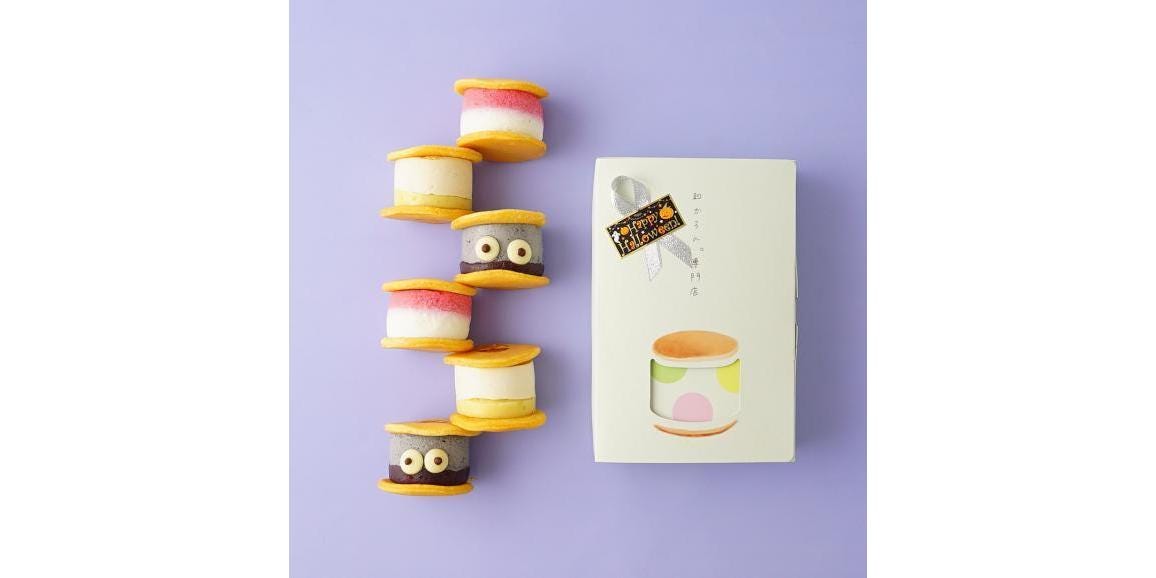 ハロウィン限定「和かろん。」セット!白玉粉を使ったモチモチした皮に、マカロンみたいな見た目のコロンとしたフォルム、中にはたっぷりのムースやこだわりの十勝産あんこなどを挟んだ和と洋が一度に楽しめる生どらやき「和かろん。」です。