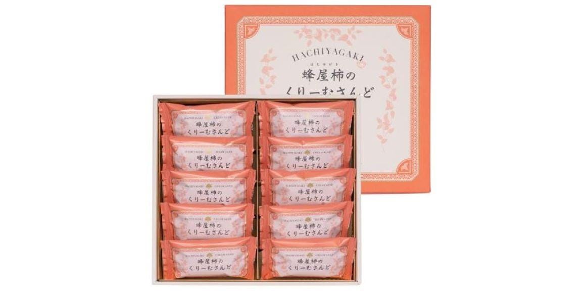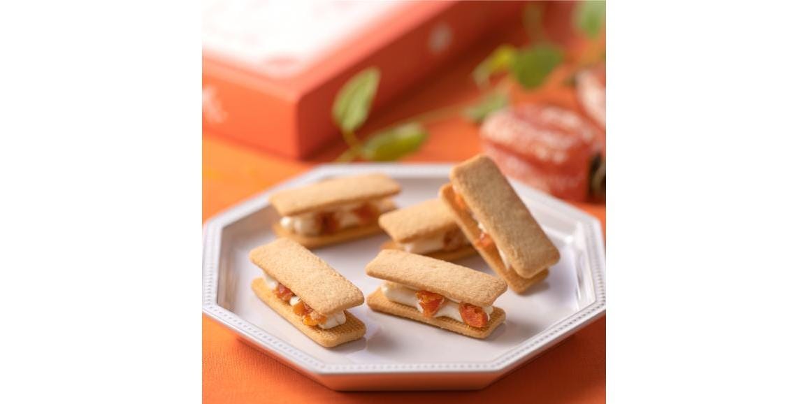 地元、岐阜県美濃加茂の特産品「蜂屋柿」を使用した、格別なお菓子です。蜂屋柿は1000年以上も歴史があり、朝廷や幕府に献上されていた干し柿。一つひとつが手作りで数も少ないため、地元の方でも手にする機会の少ない、とても希少で高級な食材です。一方で、正規品にならない蜂屋柿は農家で廃棄されているという現状も。そこで、焼き菓子へと形を変えることによって、多くの人々の手に渡ることを願い開発されたのがこちらの「蜂屋柿のくりーむさんど」。しっとりと焼き上げたクッキーに、ホワイトチョコと細かく刻んだ干し柿を練り込んだ、コクのあるバタークリームをサンドしています。仕上げに果肉の食感をしっかりと味わえるサイズの蜂屋柿をトッピングした、贅沢な一品です。