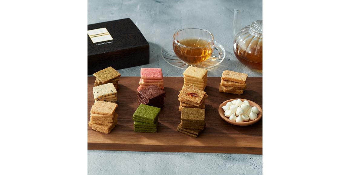 ふたつの歴史と伝統の技で、和洋中11種類の“おいしい”を一つの缶に詰めた一品で、テーマは地元「名古屋」。フランス語で「お気に入り」を意味する「ガトー・シュシュ」と名付けられたクッキーは、時に甘く、時にほろ苦く。世界各国から取り寄せた食材や、こだわり抜いた地元の食材の魅力を丁寧に引き出しながら焼き上げられています。「尾張名古屋は城でもつ」と言われた名古屋城の金鯱や桜、新緑など美しい景色をイメージしたクッキーも。コーヒーや紅茶はもちろん、お酒にもぴったりな味わいです。大人に贈る、大人のための「口福」をお楽しみください。