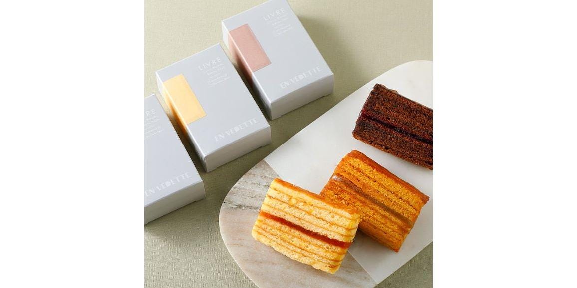 リーヴルクーヘンは、一味変わった印象の四角い形。何層にも重なってできているバウムクーヘンは、本(リーヴル)をイメージしています。