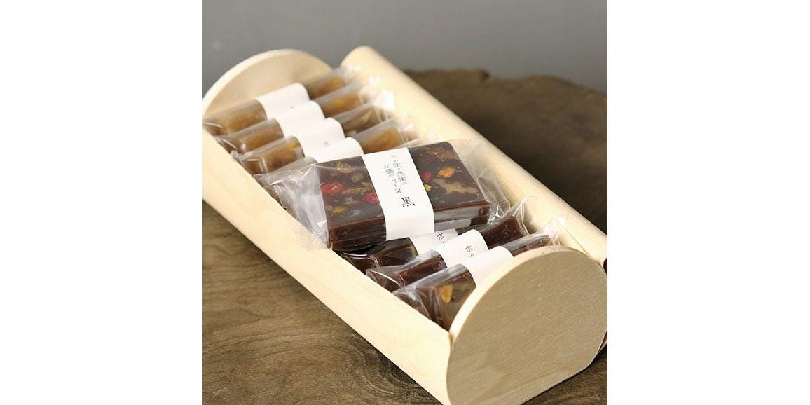 テリーヌ型に流し固めた、ケーキのような和菓子。フルーティーで香ばしい新食感の羊羹です。こちらは黒と白、二つの味が楽しめる詰め合わせ。「黒」は、クローブというスパイスで香り付けしたこし餡に、クルミや無花果、ピスタチオなどが、色とりどりに散りばめられています。「白」は、白餡に白味噌とバニラビーンズのフレーバーをのせて、松の実、南瓜の種、自家製レモンピール、レーズンを合わせたフルーティーな仕上がり。どちらも日本茶はもちろん、コーヒー、紅茶、ワインなど幅広い飲み物によく合います。より一層おいしさが引き立つので、冷蔵庫で冷やして食べるのもおすすめ。大切な方への贈り物にぴったりの一品です。
