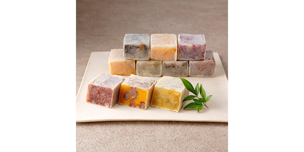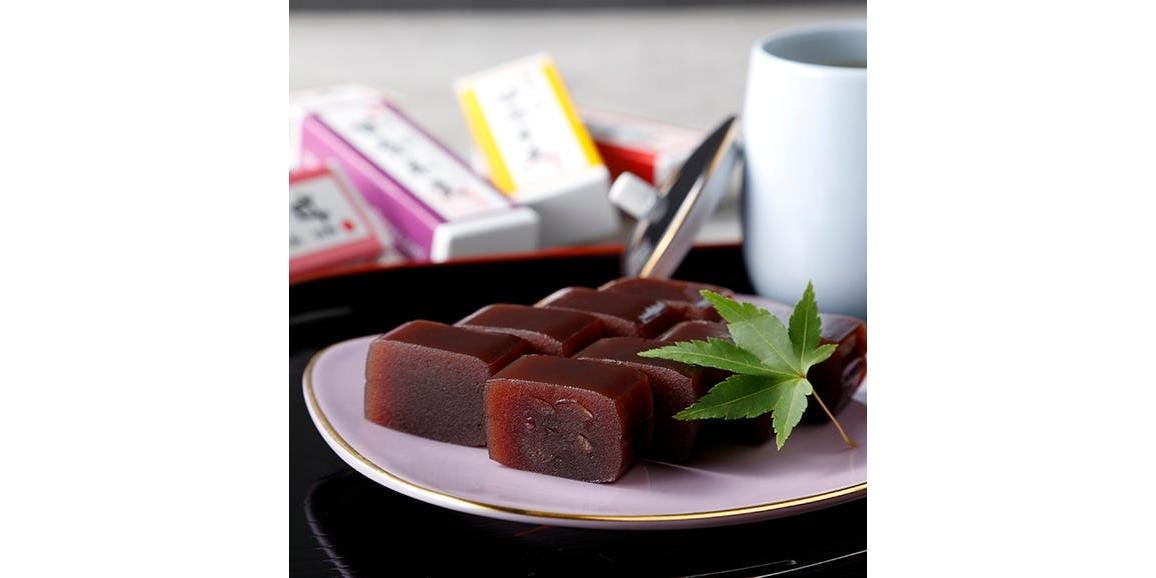 黄色の餡の中に小豆のコントラストが美しく、また製法も寒天を使わず、高級吉野葛を溶いて蒸しあげた独特のもので、もちもちとした食感がこれまでのきんつばにない特徴です。