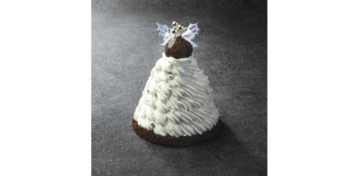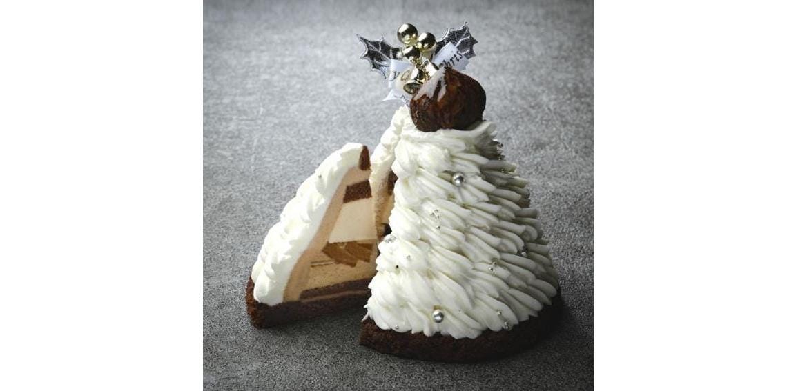フランス産マロンクリームとヘーゼルナッツのムースマロングラッセを、ミルク感たっぷりのホワイトチョコクリームをツリー風に絞り仕上げました。