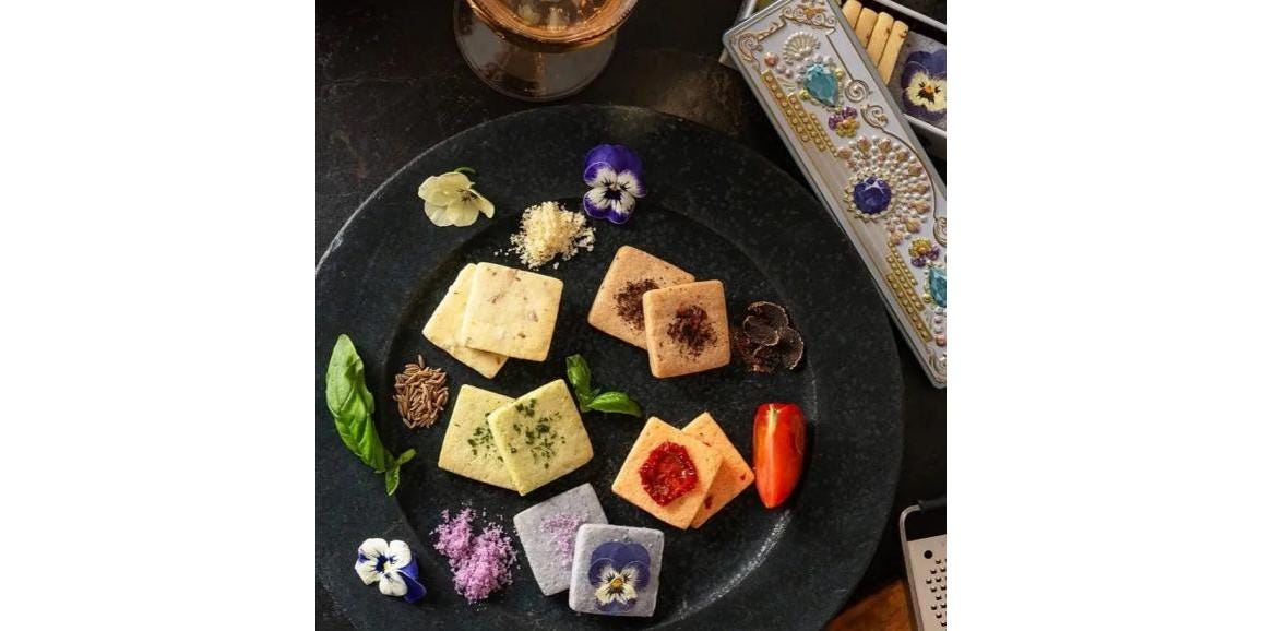 宝塚産のエディブルすみれをトッピングしたバタークッキーと、さくほろ食感のディアマンクッキーの詰め合わせで、クッキーの色はすべて自然の食材からとったもの。一面に咲く花をイメージして一枚一枚丁寧に焼き上げました。