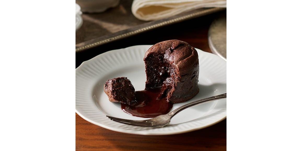 「流れるショコラの感動をレストランだけでなく、家でも味わってほしい」という想いから生まれ一品。温めるとしっかりした生地とガナッシュの水分を吸い半熟のようになった内側の生地、そして中心からとろ~り流れ出す温かいガナッシュとの食感のバランスが絶妙です。