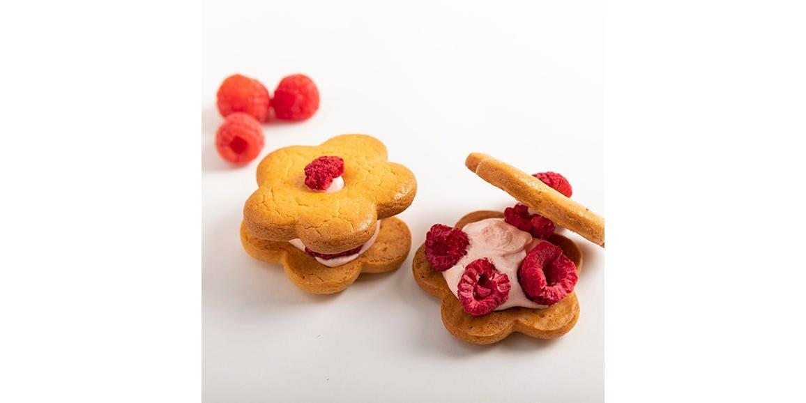 京都府舞鶴市のパティスリー<ラ・クロシェット ヒラノ>のバターサンド。バター、小麦粉、和三盆糖を使用し、丁寧に焼き上げたサクサクと香ばしいクッキーに、可愛らしいいちごとフランボワーズをサンド。