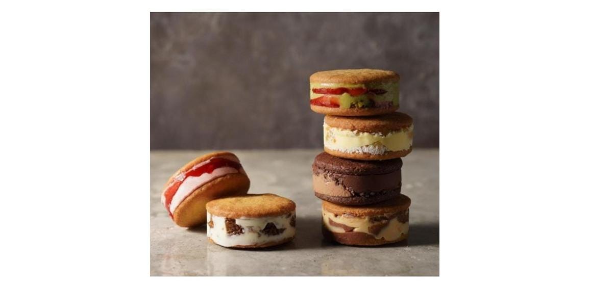 バスク生地を使った、「LIFE IS PATISSIER」オリジナルのバターサンド。生地には、北海道産の最高級バターやフランス産の小麦粉を使用しています。フレーバーは、あまおうと北海道産ヨーグルト、エクアドル産チョコレート、イタリア産ピスタチオとフランボワーズ、レーズンとマール酒、フランス産塩キャラメルとナッツ、ココナッツとパイナップルの6種類。全ての材料にこだわって作られた、最高級のバターサンドです。時間の経過とともにバタークリームがバスク生地に染み込むので、1日目と2日目で変化する味わいも楽しむことができます。