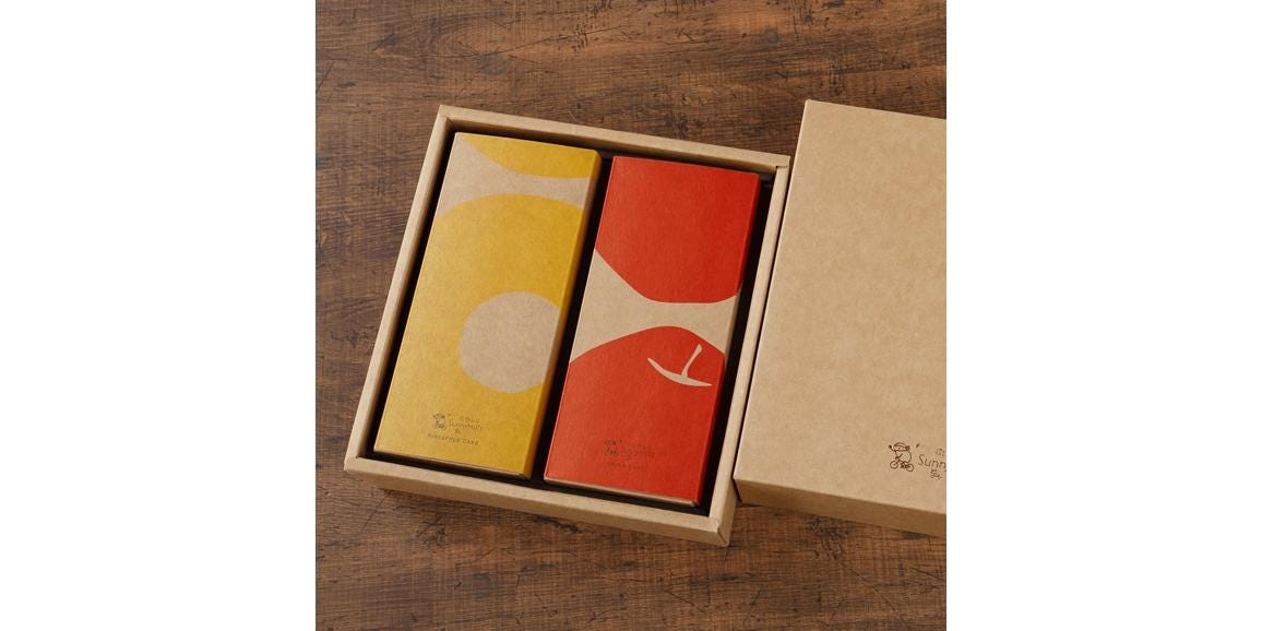 代名詞であるパイナップルケーキと、青森県産の紅玉りんごを使ったりんごケーキのセットです。パイナップルケーキは、パイナップルの甘酸っぱい味わいとザクザクとした繊維をたっぷり楽しめるフィリングを、爽やかな風味が特徴のニュージーランド産グラスフェッドバターを使ったクッキー生地に詰め込んでいます。りんごケーキは、紅玉りんごそのままの酸味と甘みをフィリングに閉じ込めた、繊細な甘さの一品。いずれも素材本来の風味や食感を大切に、そして幅広い年齢層の方が安心して食べられることを目指し、香料や添加物などは一切使用されていません。