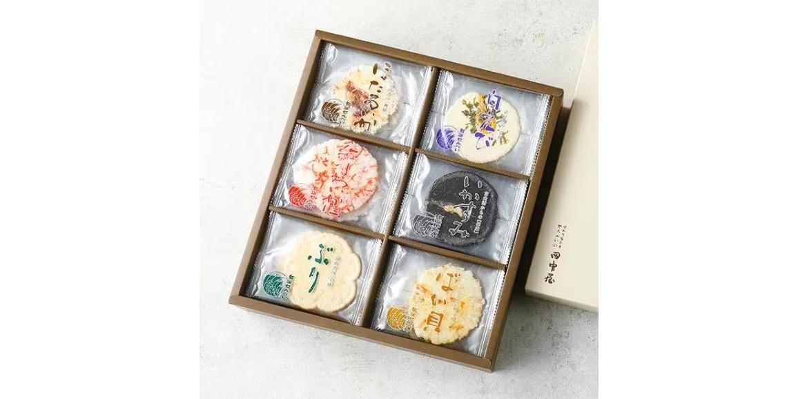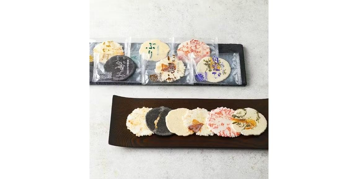神秘の海・富山湾の魅力と豊かな恵みを詰め込んだ、「昭和3年創業 せんべいの田中屋」の人気商品。飽きのこないサクッとした軽い食感、塩味と甘味のバランスが絶妙で、おやつやおつまみにぴったりです。味は、白えび、ほたるいか、いか墨、紅ずわいがに、ぶり、ばい貝の6種類。白えびやほたるいかは素材そのままを挟み焼きにし、富山湾の海洋深層水を使用することで一層風味豊かに焼き上げています。一枚ずつ個包装になっているので食べやすく、年代を問わずお贈りできる味わいなので、贈呈品や手土産におすすめの一品です。