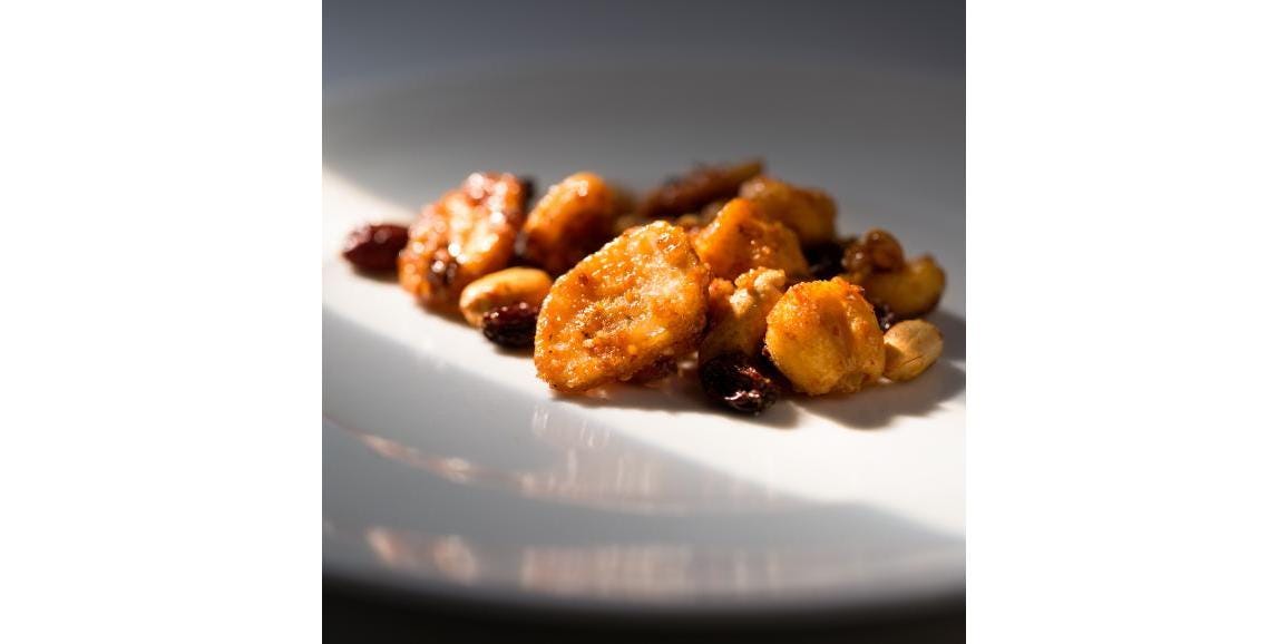 オーガニックシュガーで、ナッツとドライフルーツをキャラメリゼ、七味唐辛子ベースの「特製スパイス」で味付け。