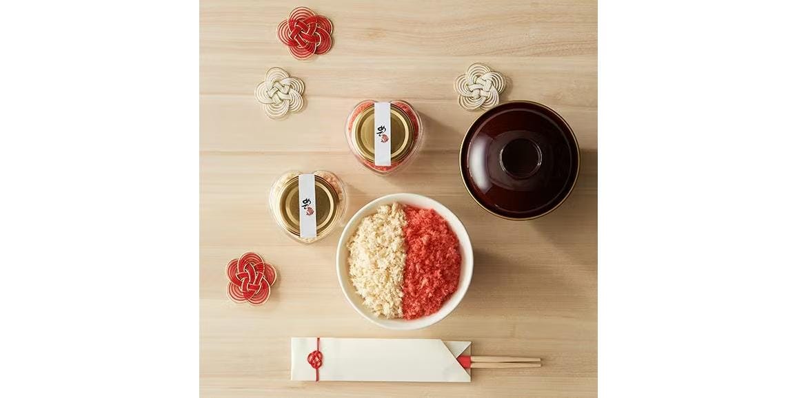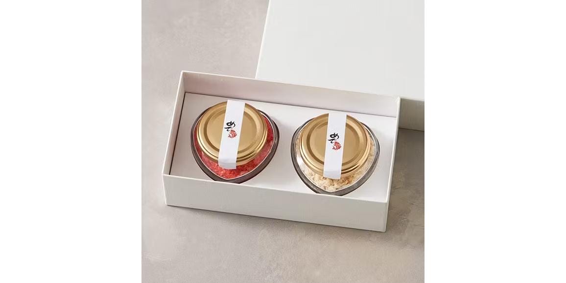 西明石ホテルの日本料理「ぜんさく」の通販ブランド「明石めで鯛や」では、“食べる幸せのお手伝い”をテーマにした商品を展開しています。「幸せの鯛そぼろ」は紅白の色合いと“おめで鯛”の組み合わせで、ハレの日にも最適の一品。紅そぼろは桜海老風味で田麩(でんぶ)のような味わい、白そぼろは鯛そのものの味わいを楽しめるシンプルな味付けが施されています。ご飯に乗せたり、お酒の肴にしたりと使い勝手はいろいろ。ハート型の瓶も可愛らしく、印象に残るギフトを演出します。