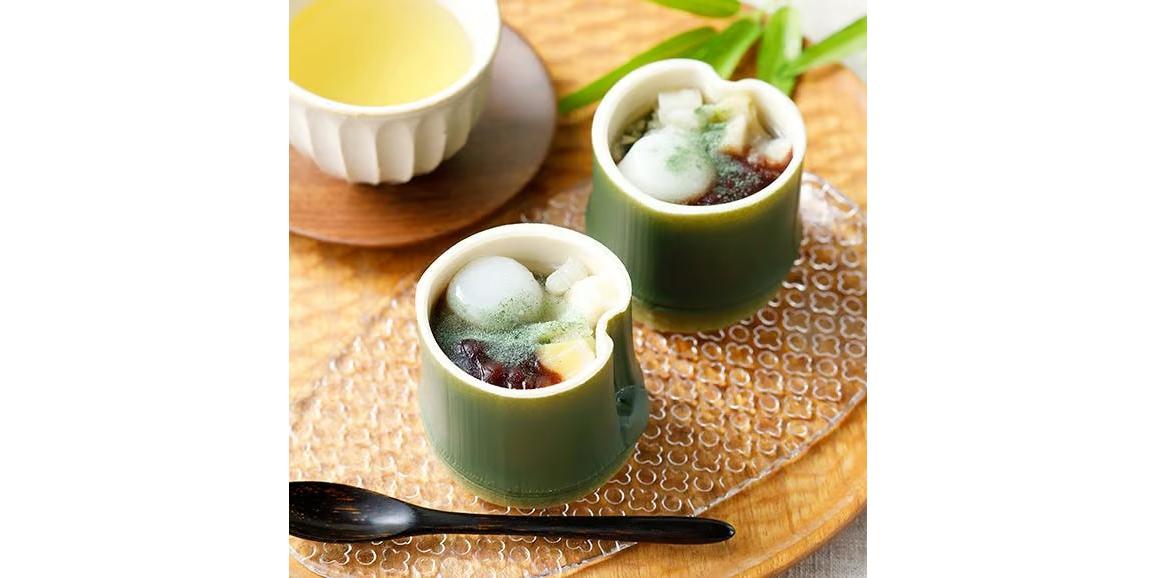 笹パウダーを配合した水羊羹に、ダイスカットしシロップ漬けにした京都府内産の筍、白玉、あずきをトッピングし、仕上げにも笹パウダーを振りかけています。