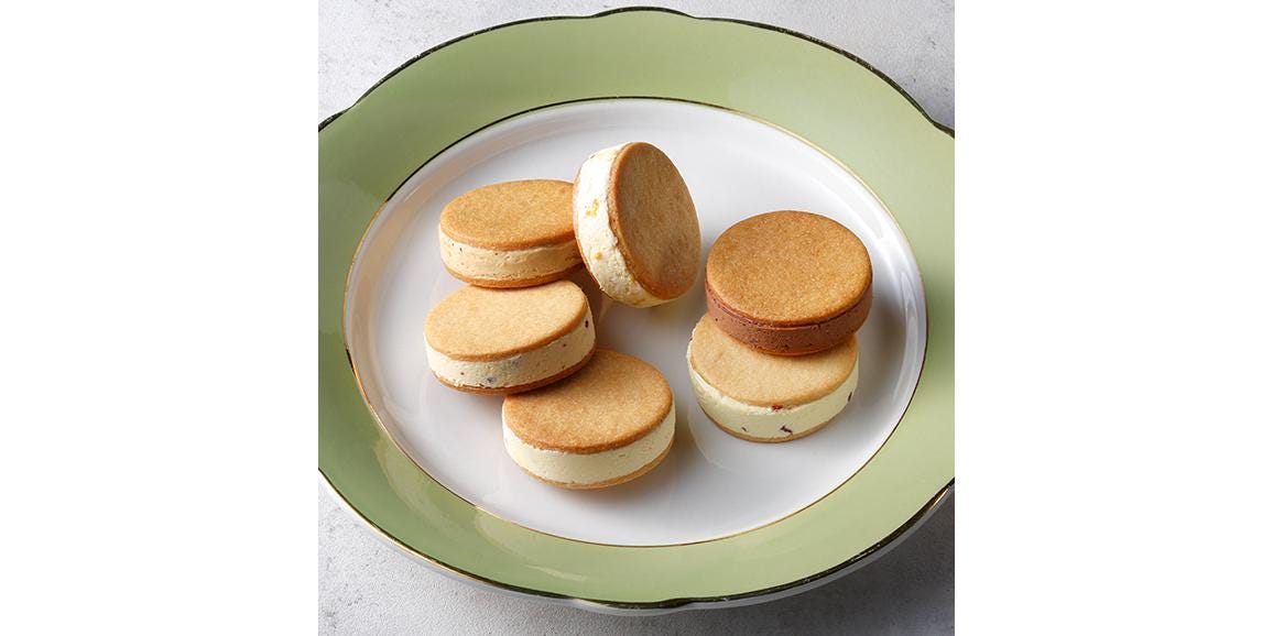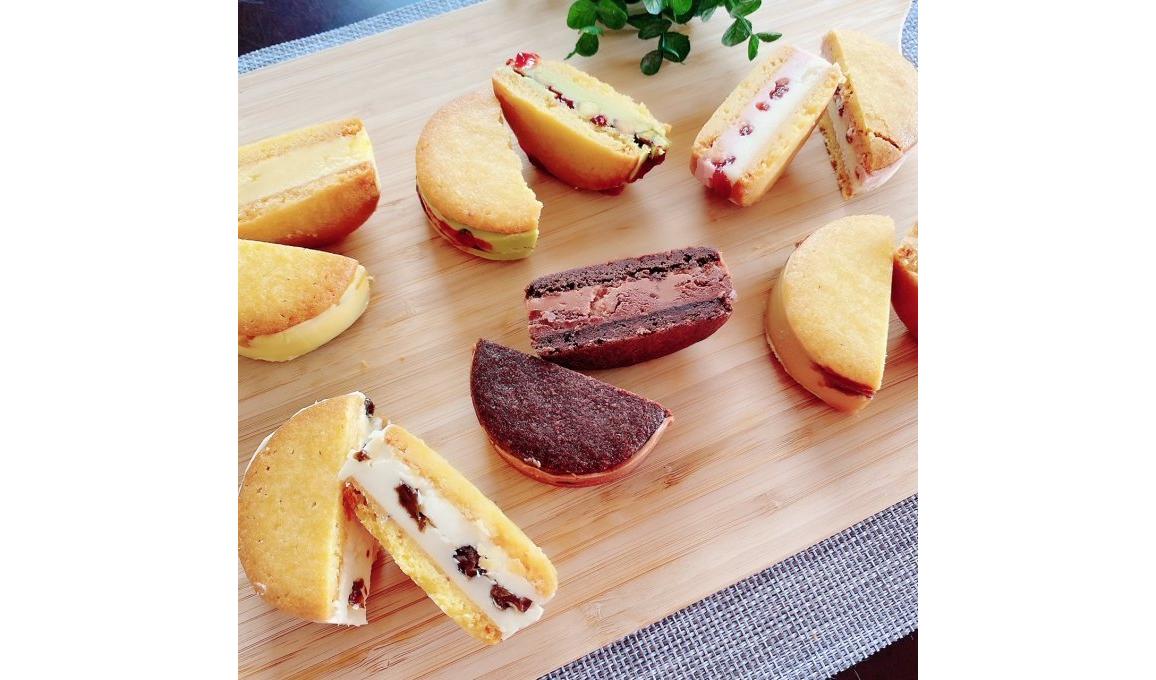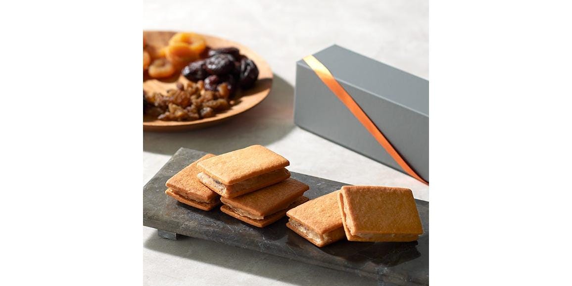フランス語で「月明り」を意味する「Clair de lune」の名を掲げるパティスリー。店名には、「お店を訪れる人たちの心の中に柔らかい癒しの明かりを灯したい」という思いが込められています。本商品は、「Patisserie Clair de lune」オリジナルのバターサンド。芳醇な国産発酵バターを使用しており、バターの風味をしっかりと感じられます。昔ながらのバターサンドクッキーとは少し違う、けれど懐かしさも味わえる一品。同店で人気の「ごろっとふるーつけーき」に使用しているセミドライフルーツを使用し、ケーキと同様にごろっと入ったドライフルーツを堪能できます。クッキー生地も一つひとつ手作りで、食べ応えも十分です。