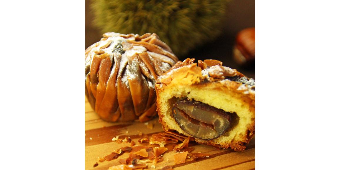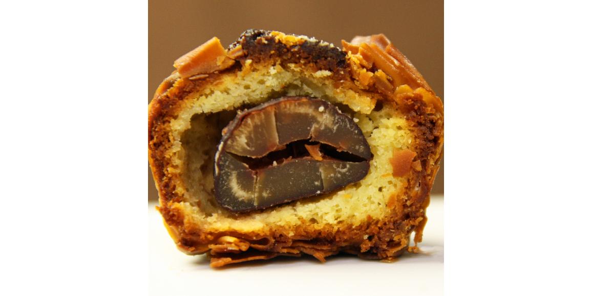パリッパリッの外生地としっとりアーモンドブードルの顔路ただよう内生地、そして渋皮栗の「栗」がまるごと一粒入っています。