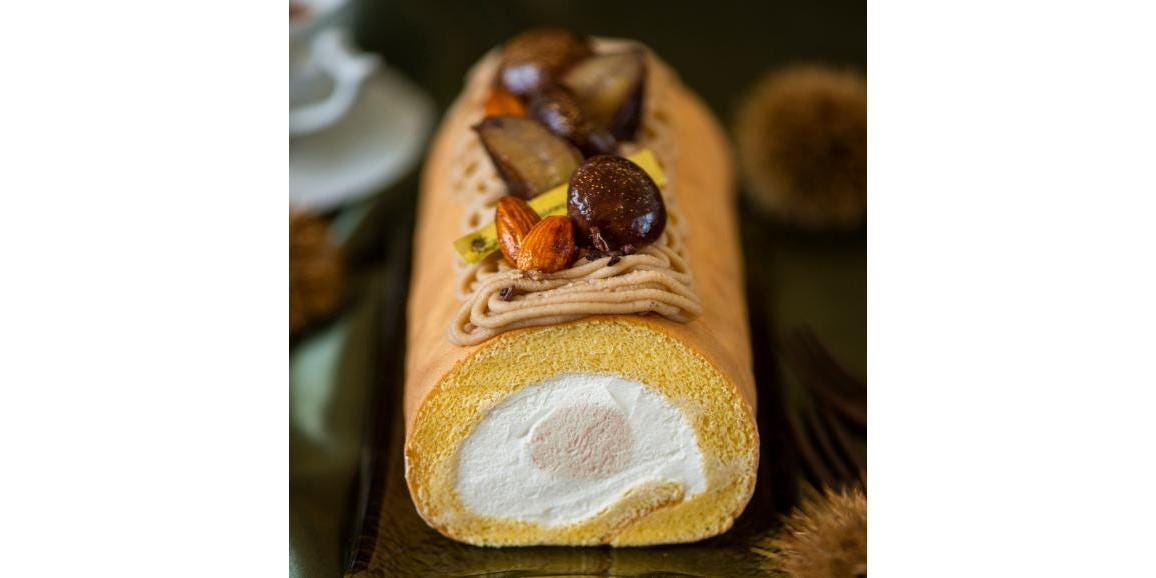 キャラメルの心地よいほろ苦さと栗の香ばしさが絶妙にマッチした、季節を感じる限定ロールです。栗のおいしさをロールケーキに。やさしい口どけの生クリームをキャラメル風味の生地でひと巻きしました。中央にはキャラメルクリームをひと絞り。トップにはモンブランクリームや渋皮つきの栗、キャラメリゼしたアーモンドをのせ、華やかにデコレーションしました。