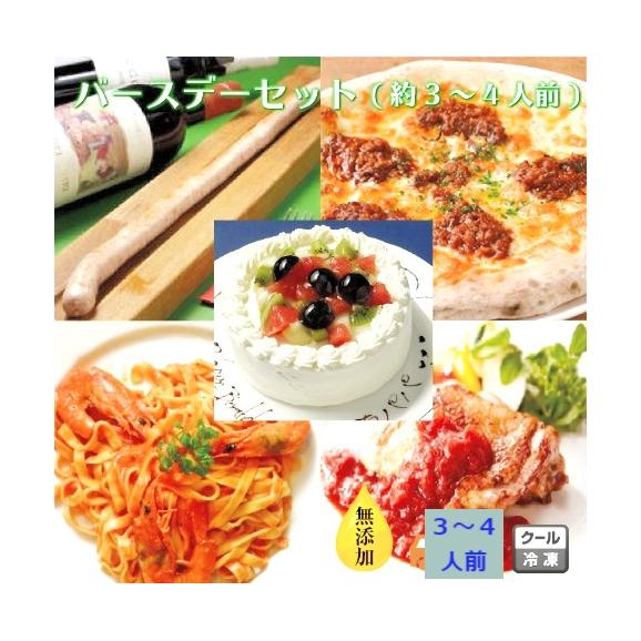 お料理内容:特製の長いソーセージ・自家製ミートソースのピッツァ「ラザーニャ」・ニューカレドニアの綺麗な海で育った「天使の海老」を使った手打ちパスタ「タリアテッレ」をイタリア産有機トマトのソースであえたパスタ・若鶏もも肉のソテーガーリックトマトソース・旬のフルーツをトッピングしていただく純乳脂肪のフレッシュクリーム生デコレーションケーキ