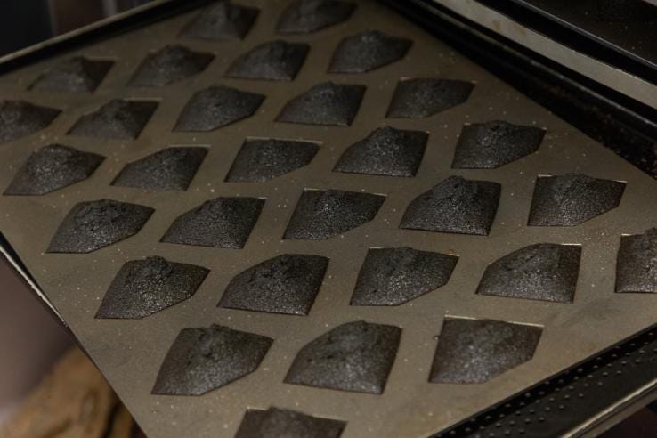 バター、卵白、砂糖、はちみつ(広島県産)、小麦粉、アーモンドプードル、ベーキングパウダー、塩、キャビア粉末(宮崎県産)、(一部に小麦・乳成分・卵・大豆・アーモンドを含む)、竹炭パウダー