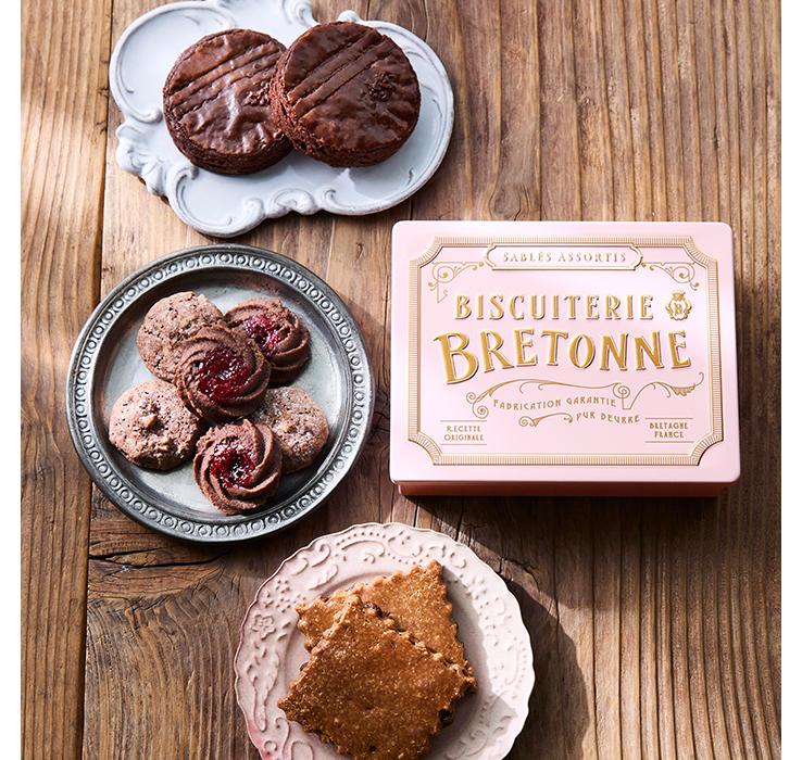 発酵バターの豊かな風味と濃厚なショコラを合わせた「ガレット・ブルトンヌ ドゥミ フィーヌ〈ショコラ〉」や、チョコチップをふんだんにとじ込めた「ショコラチップ」、香ばしいナッツを合わせた「クロッカン・ショコラ」、ショコラ生地に苺のコンフィチュールをしぼった「ショコラ・フレーズ」の、4種のショコラクッキーを淡いピンク色の缶にアソートした、ショコラ好きに贈るクッキー缶です。