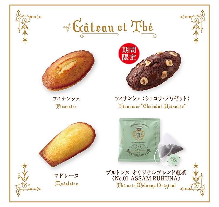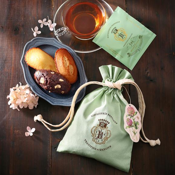 ミントグリーンカラーのオリジナルコットン巾着に、ベルギー産クーベルチョコレートと香ばしいヘーゼルナッツを合わせた期間限定の濃厚なフィナンシェ〈ショコラ・ノワゼット〉と、人気のフィナンシェ、マドレーヌの焼き菓子3種と、ブルトンヌの焼き菓子と一緒にお楽しみいただく為にお作りしたオリジナルブレンド紅茶をセットしました。