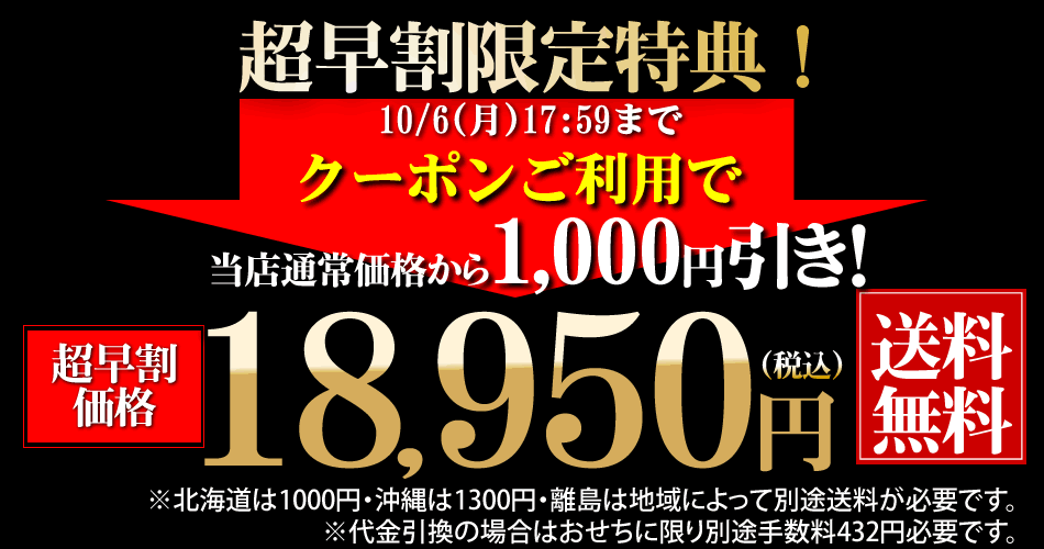 【業者】ヤマト運輸(北海道・北東北の一部は佐川急便)【備考】■商品のお届け時期お申し込み内容確認後、翌日〜4日程度かかります。それ以上になる場合は、あらかじめご連絡いたします。 ※送料別の商品:商品価格に送料が含まれていないもので、かつ、商品ページで個別に送料が設定されていない商品 送料込の商品:商品価格に送料が含まれているもの。商品ページで個別に送料が設定されている商品を含みます。 【高額購入割引特典】1配送先につき、合計8640円以上ご注文いただいた場合、送料が0円になります。【まとめ買い時の扱い】1配送先につき、送料別の商品を複数ご注文いただいた場合、 送料は上記料金表1個分送料になります。送料別の商品と送料込の商品を同時にご注文の場合は、以下の送料込商品の扱いもご参照ください。【送料込商品の扱い】1配送先につき、送料込の商品と送料別の商品を同時にご注文の場合、 送料は上記料金表に関係なく送料無料になります。ただし、商品ページで個別に送料が設定されている商品がある場合は、その送料×個数分は必要になります。【送料分消費税】この料金には消費税が含まれています。【別途送料が必要な地域】沖縄は1000円、北海道は600円・離島は地域によって必要となります。
