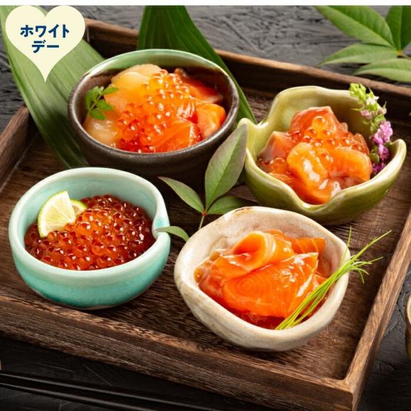 - ●本返礼品は【ホワイトデーギフト対象品】です。 ※のし対応不可 鮭親子漬け150g×2個、漬けサーモン150g×1個、三味漬け150g×1個、いくら醤油漬け150g×1個