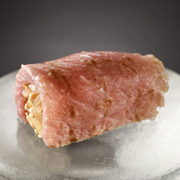 名物は「トロいなり」。炙ったやま幸のトロで薬味のきいたシャリをくるりと包むように握ります。シャリとマグロの一体感を味わってください。