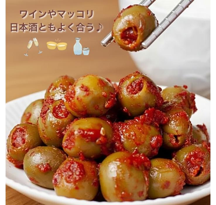 8週間塩漬けし発酵させたスペイン産グリーンオリーブと青森産ニンニク使用の薬念(ヤンニョム)で漬けた発酵食品の