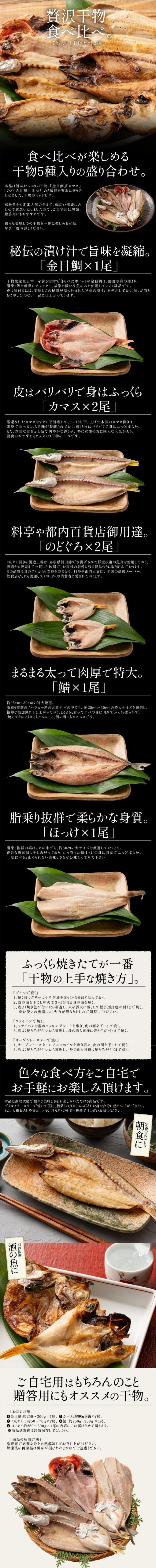 本品は旨味たっぷりの干物、「金目鯛」「カマス」「のどぐろ」「鯖」「ほっけ」の5種類を贅沢に盛り合わせにした、干物のセットです。