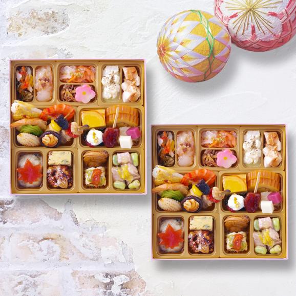 セット内容:おせち 1段×2個セット(重箱外寸:19.1×19.1×5.1cm 材質:紙)、祝箸、メニュー、解凍方法説明書
