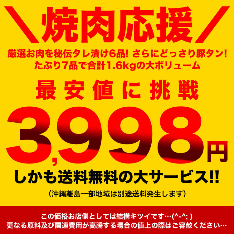 牛ハラミ(アメリカ、他)、醤油、砂糖、濃縮りんご、にんにく、濃縮洋梨、ごま、レモンジュース(濃縮還元)、香辛料、野菜エキス、豆板醤 /増粘剤(加工澱粉)、酸化防止剤(ビタミンC)、酢酸Na、グリシン、調味料(アミノ酸)、カロチノイド色素、香料、(一部に卵・小麦・ごま・大豆・りんご・ゼラチンを含む)